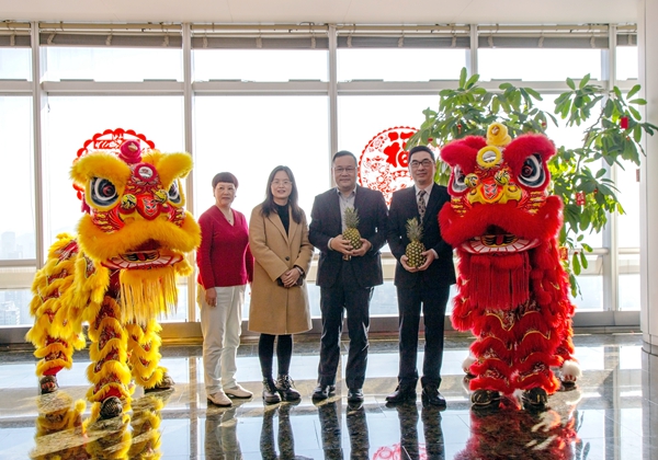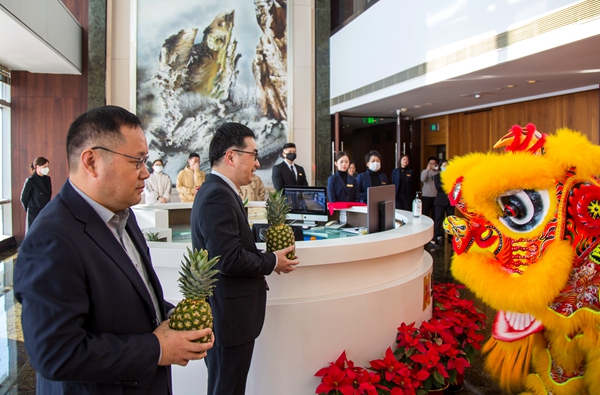 鏗鏗鏘鏘的鑼鼓聲中,雙獅眨眼賣萌、登高跳躍,獻(xiàn)上兩顆新嫩璀璨的大鳳梨,董事副總裁王偉文、資金部總經(jīng)理李蘇作為代表,欣然接福。鳳梨在閩南一帶用俚語(yǔ)講,便是“旺來”,作為諧音,寓意極好。