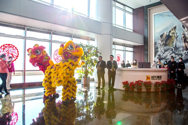 集團(tuán)公司董事副總裁王偉文、資金部總經(jīng)理李蘇,攜眾員工在財(cái)富中心42樓開門納福,將瑞物紅金雙獅請(qǐng)進(jìn)大堂,寓意招財(cái)進(jìn)寶、幸福吉祥。