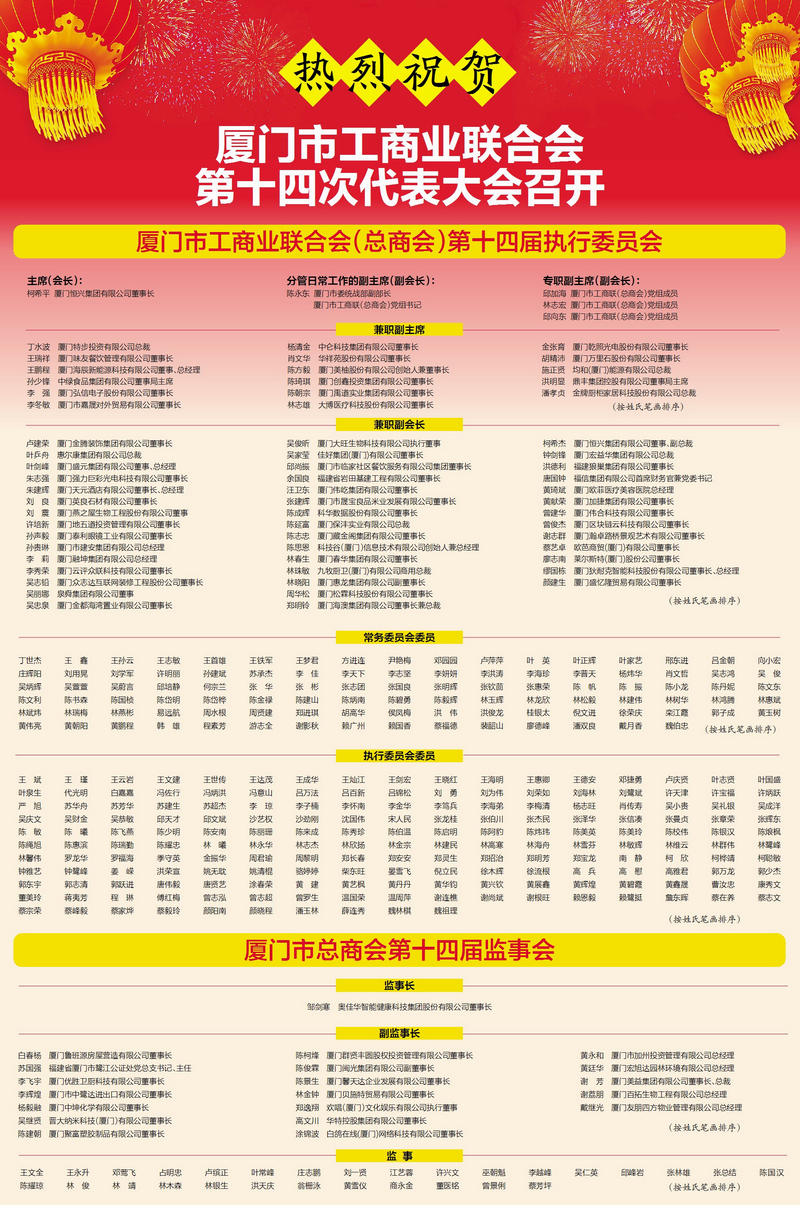 會(huì)議選舉產(chǎn)生廈門(mén)市工商業(yè)聯(lián)合會(huì)(總商會(huì))第十四屆執(zhí)行委員會(huì)、廈門(mén)市總商會(huì)第十四屆監(jiān)事會(huì)組成人員,恒興集團(tuán)董事長(zhǎng)柯希平連任主席(會(huì)長(zhǎng)),奧佳華集團(tuán)董事長(zhǎng)鄒劍寒當(dāng)選監(jiān)事長(zhǎng)。